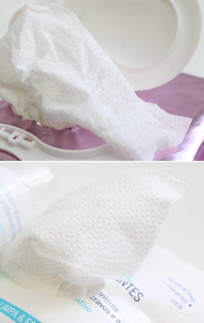 O diferencial de ambos os lenços é a textura. Eles tem umas mini esferas de um lado do lenço que auxiliam na limpeza e fazem uma leve esfoliação. Do outro lado do lenço, é macio e normal.